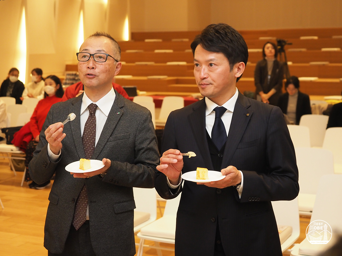 Governor Saito tasting a cake featured at the ceremony with Hiroyuki Koike (left), Executive Director of Felissimo.