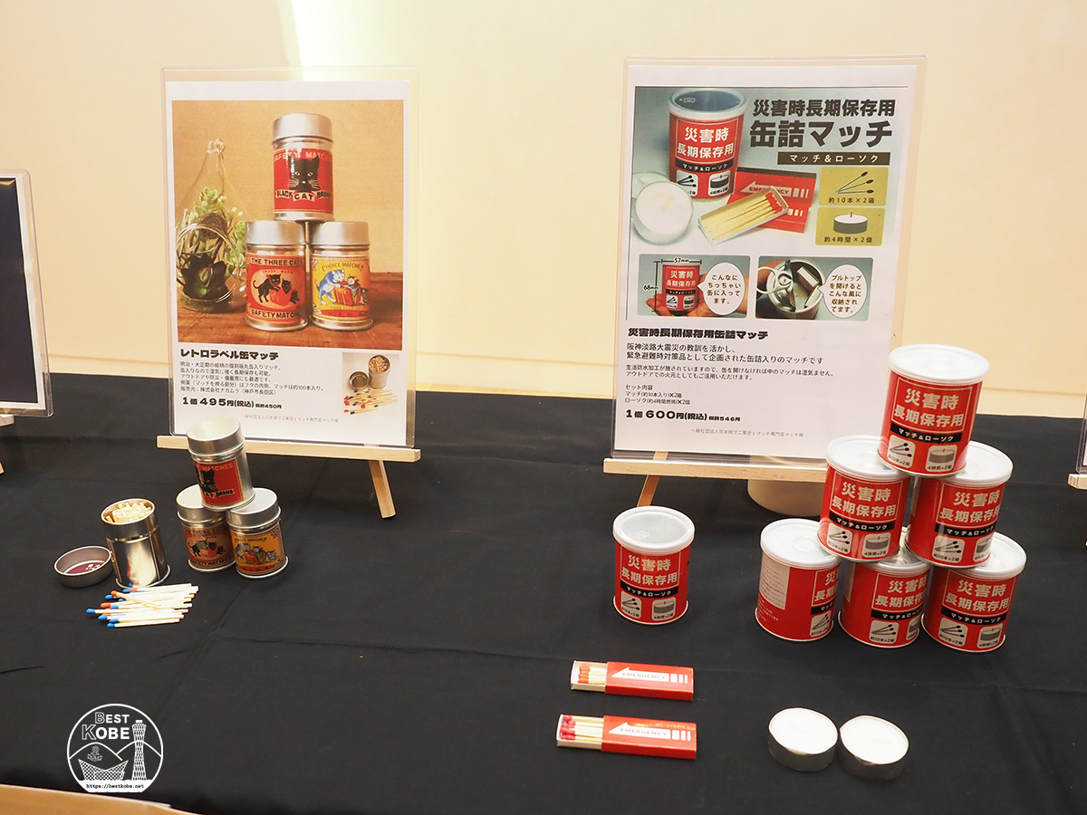 Matches are a traditional local industry of Hyogo Prefecture—remarkably, around 80% of all matches produced in Japan come from Hyogo. On display were nostalgic retro-style match tins as well as long-term storage matches designed for use during disasters.