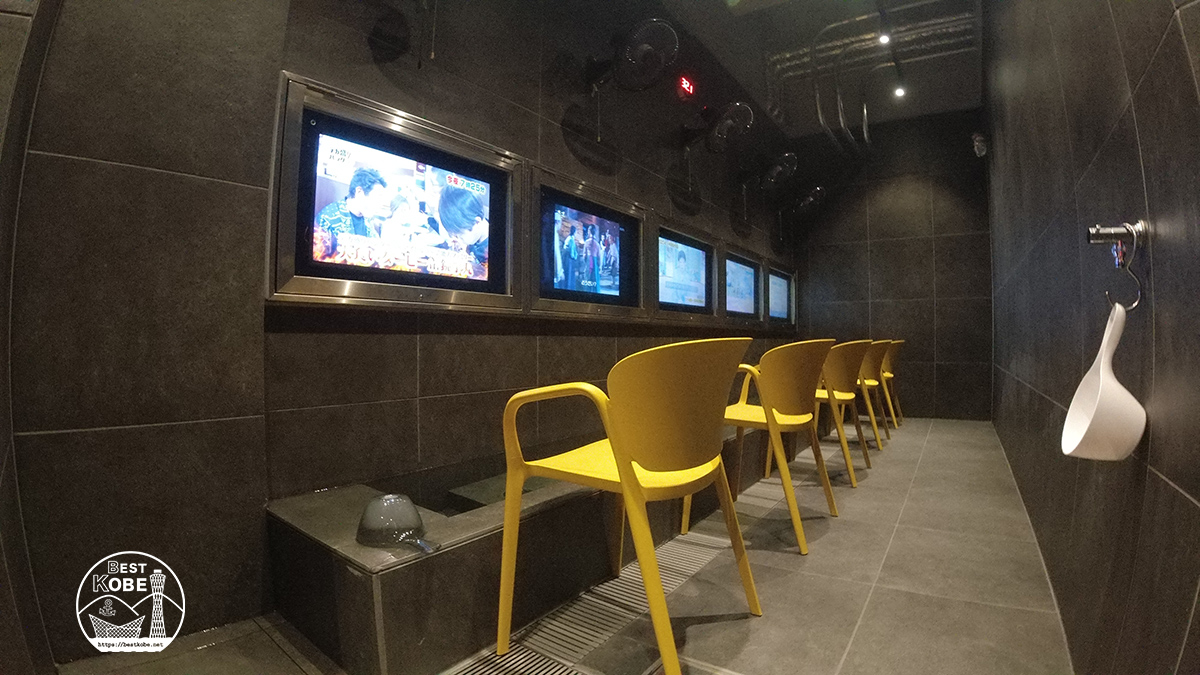サウナ後の「ととのえる」施設も充実。こちらは足湯が楽しめる「湯テレビ」。前面には32型テレビを設置。頭上には個別の扇風機も。