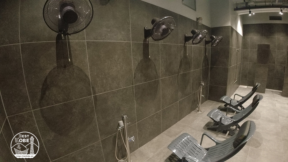 浴室内にリクライニングチェアを配置。それぞれの頭上に設置された扇風機で風を浴びてととのえられるスペース。